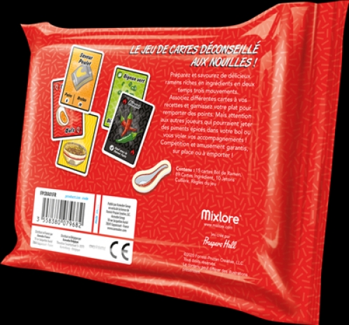 | REMARQUE | Dépêchez-vous de préparer et de déguster de délicieux bols de ramen remplis de bons ingrédients avant que vos adversaires ne vous pourrissent votre recette?! Ramen Fury est un jeu rapide et fun, dont la présentation elle-même en fait un produit qu’on a envie de posséder?! En effet, l’emballage du jeu se présente comme une vraie boîte de ramen que l’on ouvre et ferme à l’aide d’une fermeture autocollante. Collectionnez des cartes et faites des combinaisons pour marquer des points en suivant différentes recettes. Ajoutez des garnitures pour augmenter vos points. Dans le même temps, faites attention aux autres joueurs qui vous lancent des piments chili épicés ou retirent les aliments directement de vos bols?! Ne vous laissez pas faire, faites-leur la même chose. Contenu 15 cartes bol, 89 cartes ingrédient, 10 pions cuillère, 1 livre de règles |